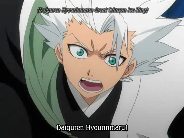 And she does nothing to stop it eating him. Wow. Oooh and the plot thickens. It's some kind of bull armadillo. And er…. She looks kind of cool there, though crappy quality no telling of that. And Hitsugaya! Yay! Awesomeness. But his sword looks like a giant toothpick.