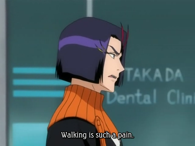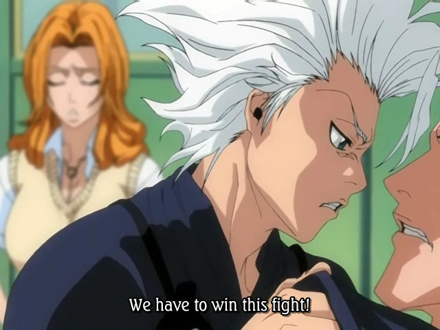 Yay! Hitsu's first. Aww… Yumi's been so… feminine this episode. And they're all going out to dispatch one hollow? I find Renji's hair poking out of the headgear amusing though.