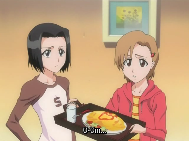 Now, the odd ended screen caps: Grimmjow fights with one arm, guess where 'Hime is!, the cute Rukia in ketchup omelette thing and urm... did the continuity person not catch this?